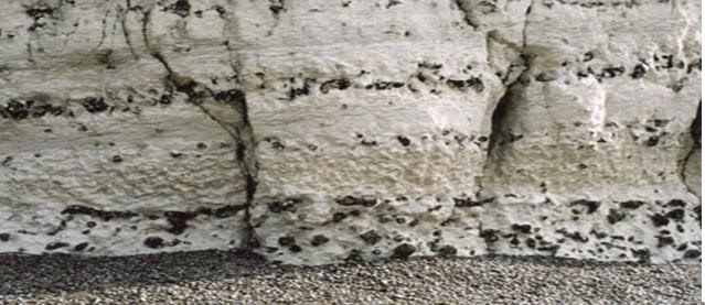Pormenor do cré, na base da arriba, com interstratificação de nódulos de sílex negro. Imagem obtida em «ruedeslumieres.morkitu.org»
