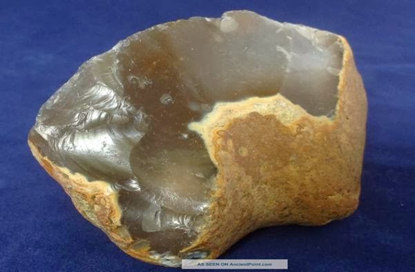 Sílex, mostrando a fractura conchoidal característica. Notar a crosta (patine) acastanhada clara, de opala e hidróxido de ferro, no cortex. Imagem recolhida em «ancientpoint.com»