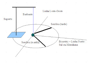 A sombra do barbante irá diminuir e mudar de direção até determinada hora, depois, à tarde, a sombra do barbante começará a aumentar novamente. No momento em que a sobra do barbante tocar o círculo, traçamos um risco para marcar a sombra da tarde. A sombra da manhã e a sombra da tarde formam um ângulo, e a metade deste ângulo nos dá a posição da bissetriz do arco. Essa bissetriz é a própria Meridiana local ou linha Norte-Sul.