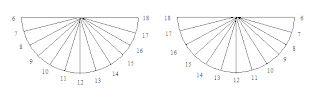 Cada semicírculo possui 180 graus dividido em 12 horas, o que nos dá 180/12 = 15 graus. Cada risco será desenhado em um ângulo de 15 graus em relação ao outro. Se adotássemos um Relógio de Sol Horizontal, teríamos que calcular cada traço, pois o desenho dos traços seriam mais complicados.