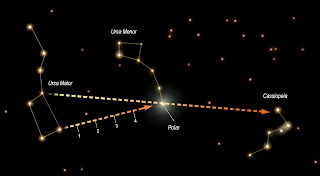 Orientar-se à noite no céu parece ser difícil, mas na realidade é como ler um mapa de estradas. Se olharmos para o céu durante algum tempo percebemos que toda a esfera celeste parece rodar em torno de um ponto fixo. No hemisfério Norte, a esse ponto chamamos Pólo Norte Celeste. Próximo desse ponto encontra-se uma estrela não muito brilhante, mas importante porque está orientada a Norte e ao contrário de todas as outras estrelas mantendo a mesma posição ao longo da noite. No meio de tantas estrelas apenas temos que encontrar a Estrela Polar.