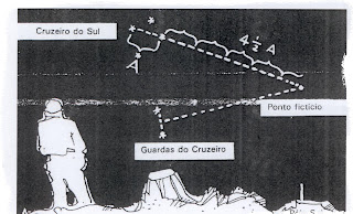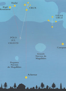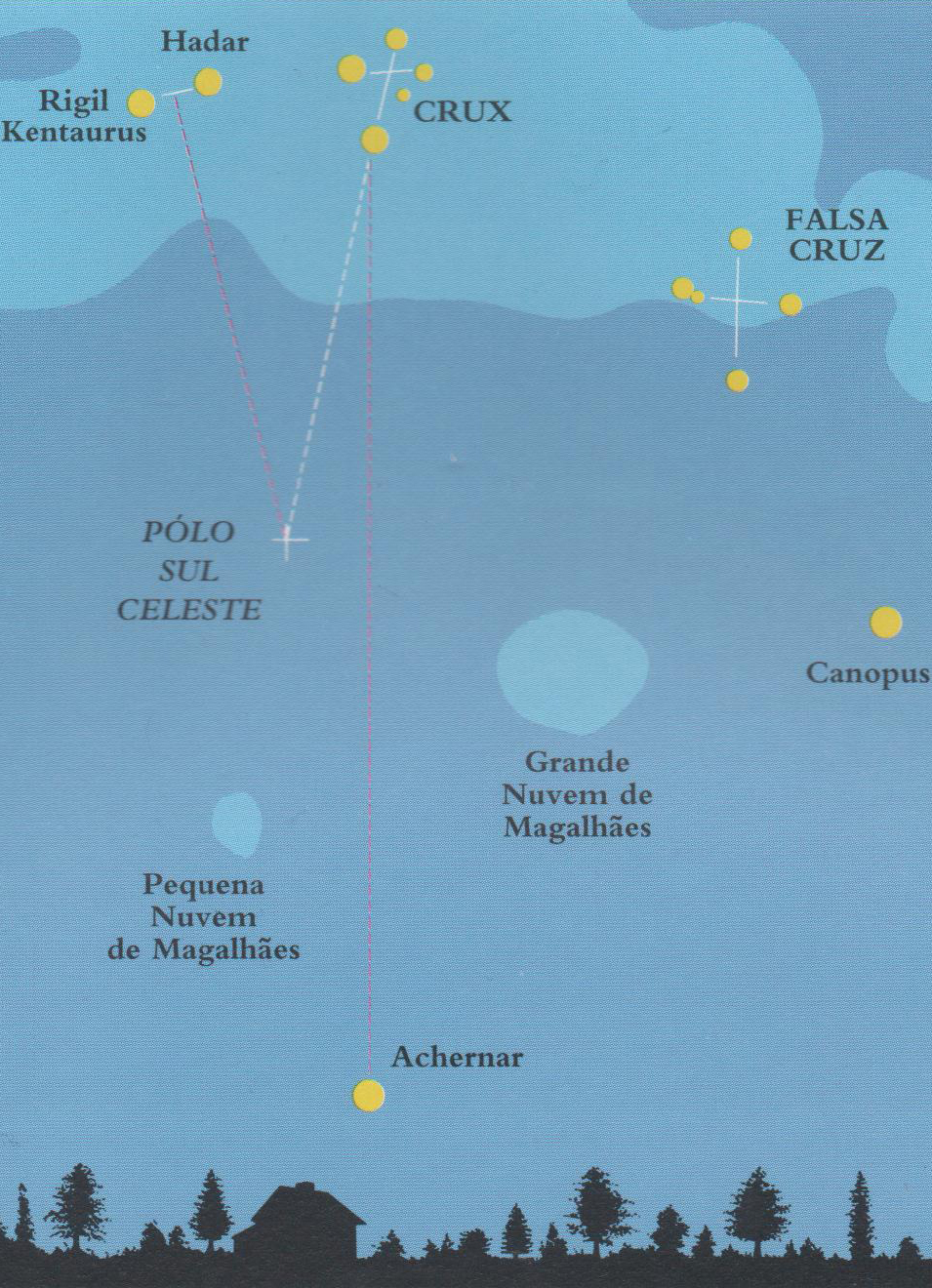 A Sul do Equador, encontrar esse ponto cardeal não é assim tão fácil, pois não há uma estrela brilhante próxima. Ainda assim, a constelação do Cruzeiro do Sul ajudará a localizar a direcção geral do Sul e, a partir desta base, qualquer outra direcção. Este grupo de quatro estrelas brilhantes tem a forma de uma cruz, e daí o seu nome. As duas estrelas que formam o eixo maior do Cruzeiro são designadas por “pontas”. Prolonga-se o eixo maior da Cruz, na direcção do nosso pé, quatro vezes e meia a distância que separa as duas “pontas” e obtém-se um ponto imaginário. Este ponto assinala a direcção geral do Sul. Deste ponto, olha-se perpendicularmente à linha do horizonte e escolhe-se uma referência no terreno.