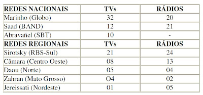 Os empresários, os latifundiários da comunicação, têm alcance nacional ou regional, conforme o caso. São oligarquias históricas, como se vê abaixo:
