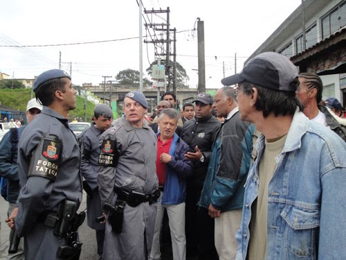 A polícia acompanhou a marcha a bordo dos veículos, espirrando, vez por outra, spray de pimenta sobre os manifestantes. Paulo, outro que não quis dizer o sobrenome, vice-presidente da Associação dos Moradores do Jardim Eliana, teve o rosto queimado pelo spray que foi lhe atirado diretamente: “jogou assim, o jato na minha cara mesmo… tá queimando”. Além disso, quando algum manifestante se colocava na via, os policiais aceleravam violentamente os carros, chegando algumas vezes a atingir a pessoa para que essa voltasse para a calçada. Os participantes começaram a gritar palavras de ordem como “abaixo a ditadura” e “o povo na rua, Kassab a culpa é sua” e a cantar “eu sou brasileiro, com muito orgulho, com muito amor”, como única forma de reagir à truculência policial, já que o número de manifestantes era pequeno em relação ao número de policiais. Como resposta, a Polícia Militar soou as sirenes dos carros, tornando o canto quase inaudível a quem estava do outro lado da avenida.
