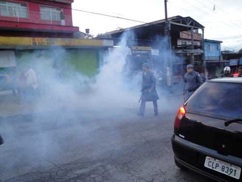 Os manifestantes, porém, não chegaram a andar quinhentos metros e foram fechados pelos policiais da Rocam [Ronda Ostensiva Com Apoio de Motocicletas], sendo cobertos, em seguida, por uma nuvem de gás e pelo barulho das explosões de inúmeras bombas de efeito moral lançadas pelos policiais da Força Tática. Houve correria, uma das faixas foi tomada pelos policiais e a marcha se dispersou. A Polícia Militar acabou fechando, ela mesma, a avenida e desviando o tráfego no sentido centro por outras ruas da região. Cerca de 15 minutos depois a população se reuniu no estacionamento de uma padaria e, após nova conversa com os policiais, decidiu prosseguir a marcha pela calçada.